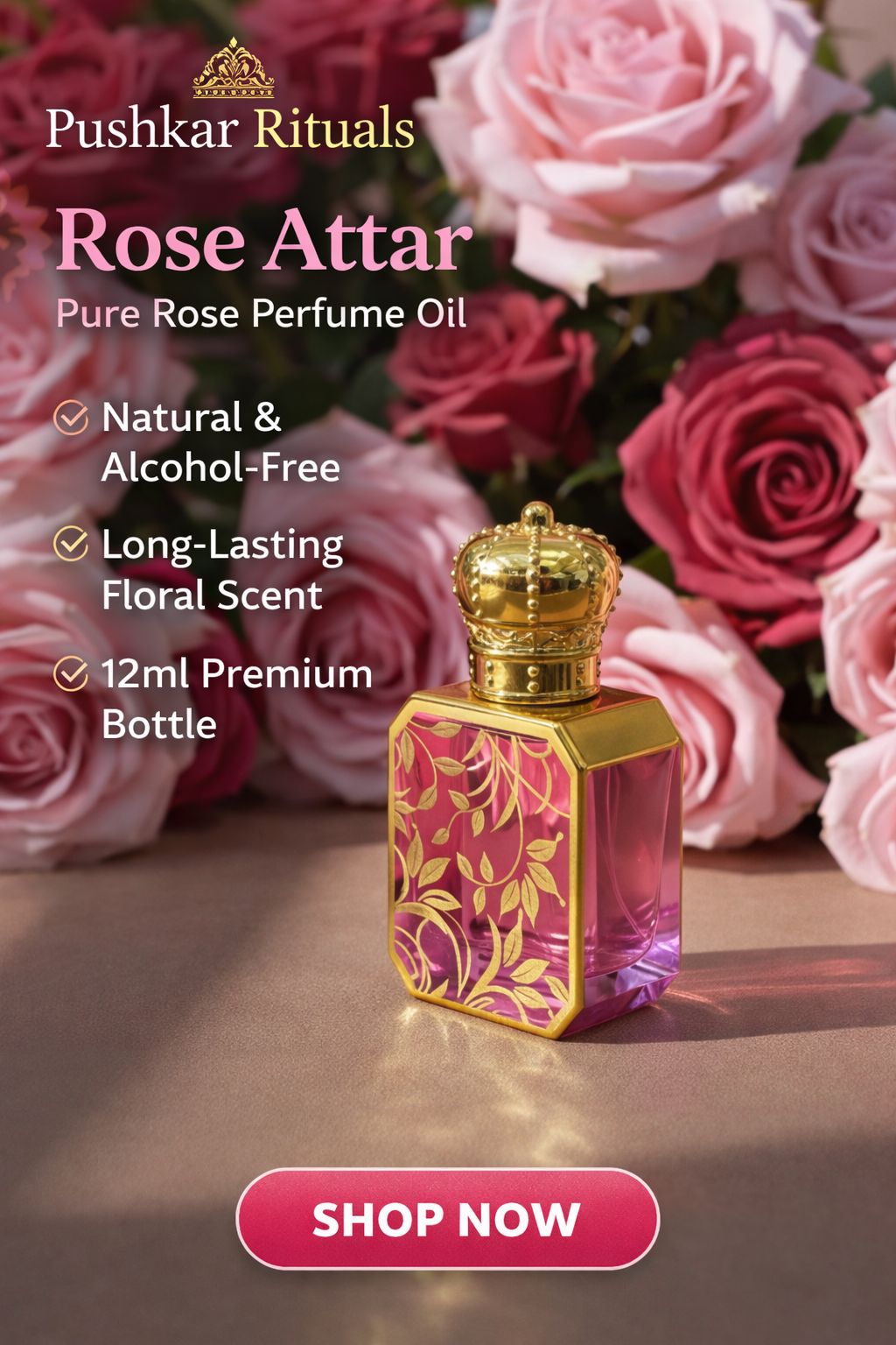 Experience the timeless essence of Pushkar with our signature Rose Attar. Distilled from the finest petals, this pure perfume oil captures the soul of the “Rose Garden of Rajasthan.” Encased in a stunning 12ml premium gold-filigree bottle with a crown cap, it is as much a piece of art as it is a fragrance.