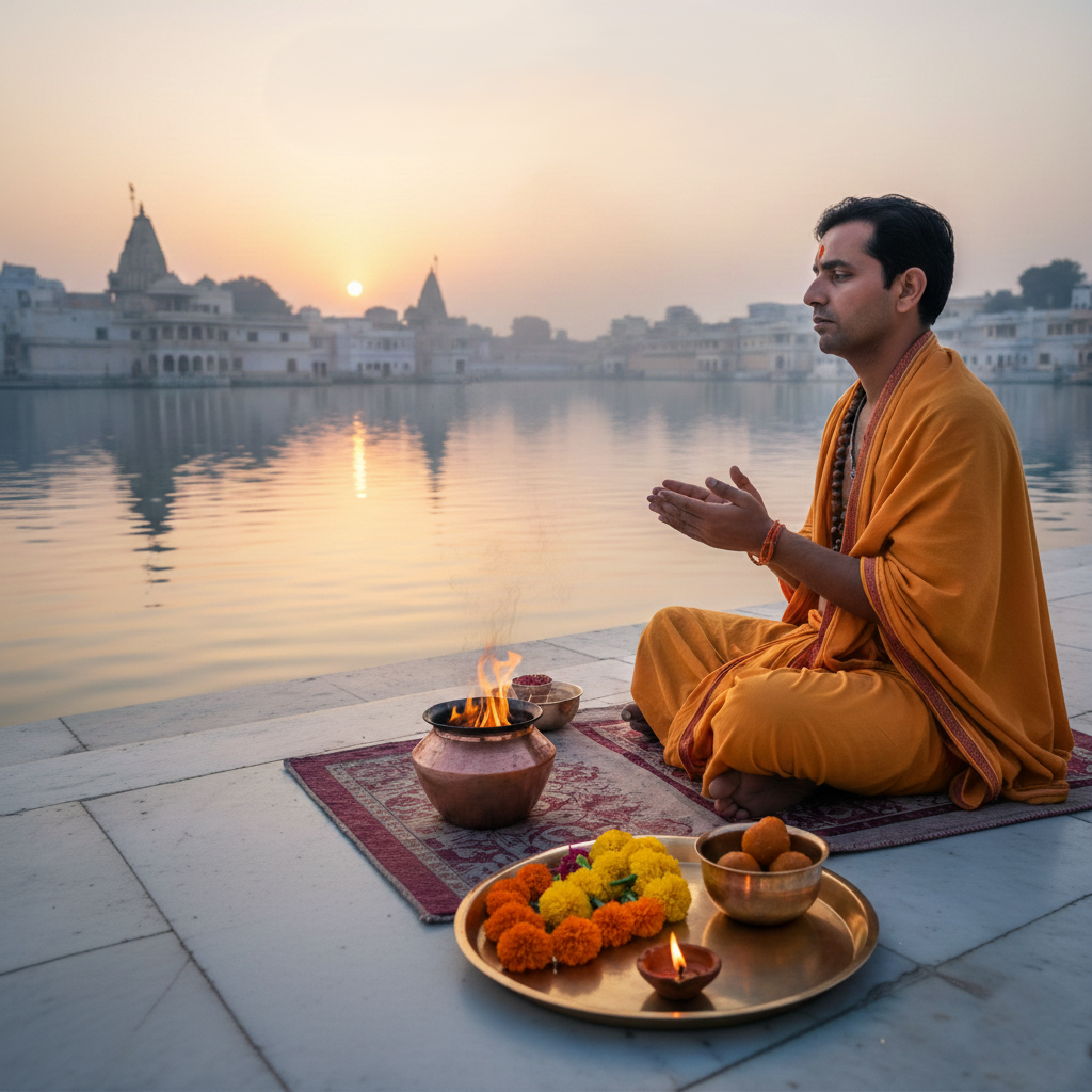 Performed under the guidance of experienced Pandit Ji according to authentic Vedic traditions, the ritual involves offering til (sesame seeds), kusha grass, and sacred water (jal) along with mantra chanting and proper vidhi. The serene spiritual environment of Pushkar enhances the sanctity and effectiveness of the ceremony.